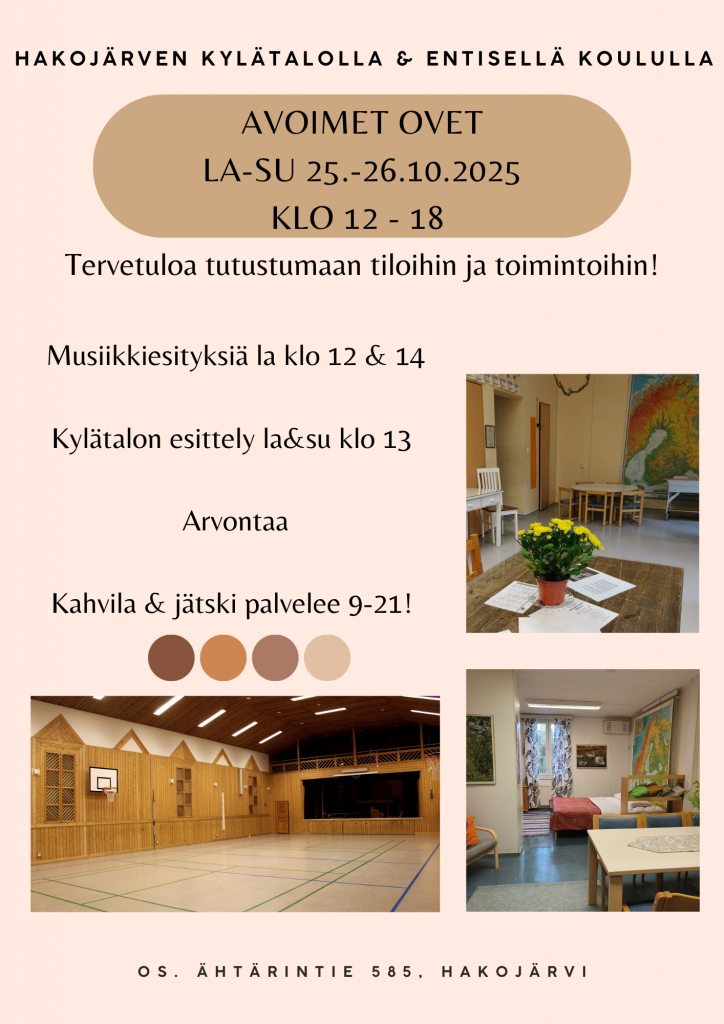 Avoimet ovet Hakojärven kylätalolla ja entisellä koululla la-su 25.-26.10.2025by Hakojärven kyläsivuton Posted on 25.10.202525.10.2025 Musiikkiesityksiä la klo 12 & 14 Kylätalon esittely la & su klo 13 Arvontaa Meiän Grilli paikalla lauantaina klo 19 – 21