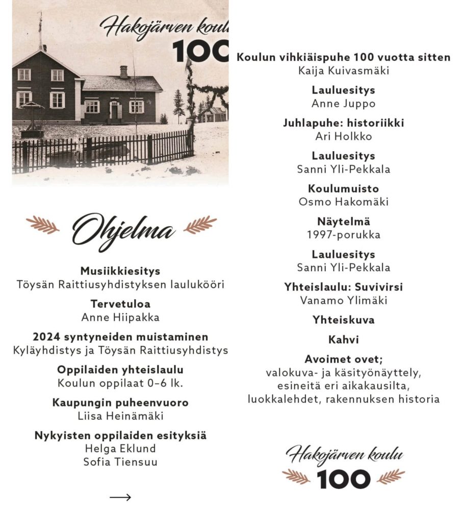 Koulurakennus on vihitty käyttöön 21.11.1925. Lukuvuosi 2024-2025 jää Hakojärven koulun viimeiseksi. KOULU100 -juhlaan oli tervetulleita kaikki Hakojärven koulun entiset ja nykyiset oppilaat ja opettajat sekä muut kylän ystävät. Juhlavieraita kokoontuikin paikalle n.300 ja päivä jäi varmasti ikimuistoisena juhlaväen mieleen. Juhlaohjelma oli parituntinen ja sen päälle nautittiin kakkukahvit ja tutustuttiin koulurakennuksen vaiheiden historiaan kuvien sekä erilaisin näytteille tuoduin koululaisten käsitöiden ja muiden koulutarvikkeiden kautta.